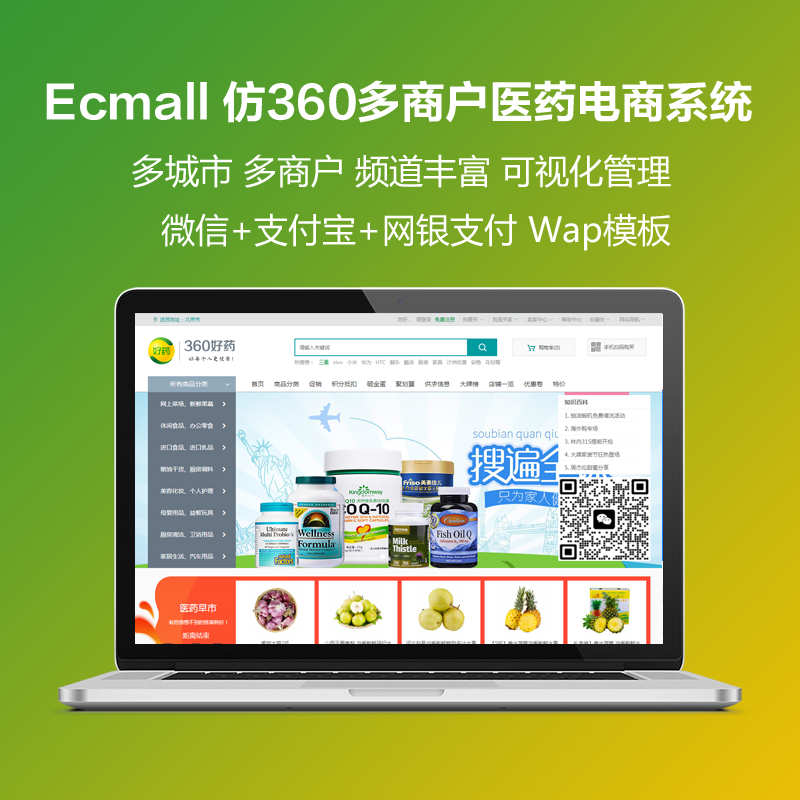 Ecmall仿360医药多商户电商系统支持多城市分站管理和多商户入住功能,可以接入微信公众号和小程序系统,支持手机、IPAD等多终端访问